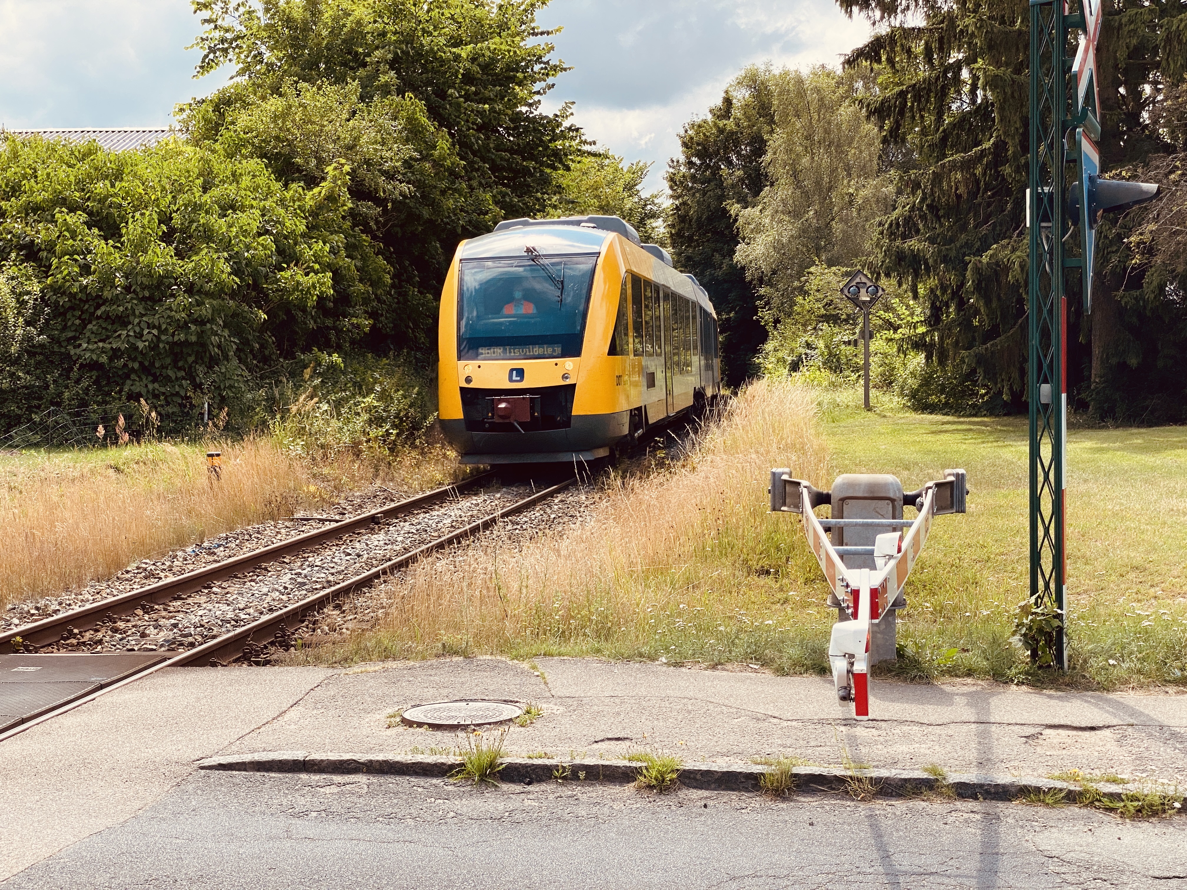 Billede af tog ud for det tidligere Slotspavillonen Trinbræt, som har ligget til højre i billedet.